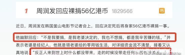 周润发的妻子陈荟莲也和他有着相同的心态,之前有传闻称周润发决定裸捐56亿港币,周润发则回应是他老婆决定的。
